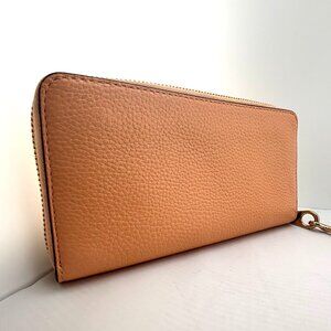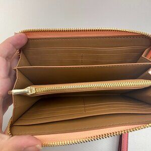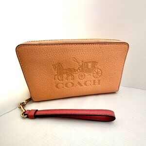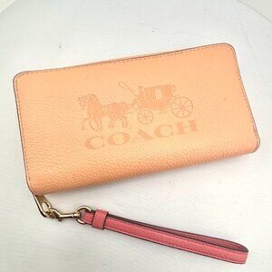 A beautiful and highly functional piece from Coach. This long zip-around wallet is crafted from soft, durable pebbled leather in a lovely peach/apricot color, featuring the iconic embossed Horse and Carriage logo. It comes with a detachable wrist strap in a contrasting pink for added versatility. The accordion-style interior offers incredible organization for all your cards, cash, and essentials.