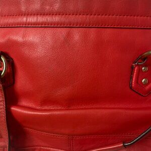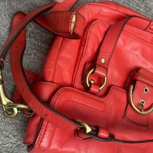 Coach Hot Orange Gold Hardware Crossbody Bag. Called the "Campbell Leather Small Flap Satchel." One front pocket. 2 inside pocket and 1 inside zip pocket. Good everyday bag to hold the essentials. Rich orange-red color. In good condition. Minor scuffing on corners. Loose stitching on crossbody strap (pictured). Retails: $398.