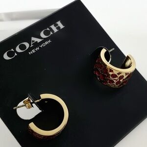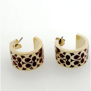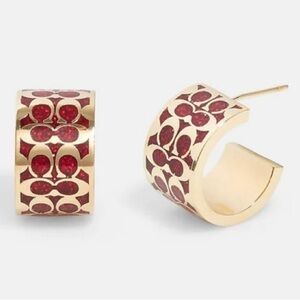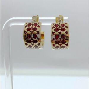 Gold tone wide huggie hoop earrings with engraved signature quilted C's, and embellished with glittery red shadow enamel