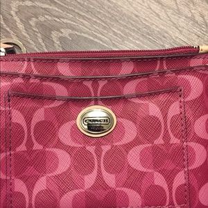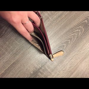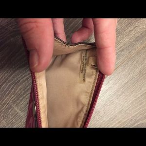 Super convenient ID holder has three pockets, two exterior and one zippered. There is minimal staining on the inside (see picture). ID fits in either outside pocket