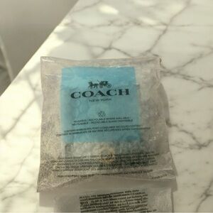 These Coach earrings showcase a captivating blend of gold and silver tones, featuring a circular stud adorned with shimmering crystals and a dangling teardrop charm. The minimalist design offers a touch of elegance and movement, perfect for any occasion.
