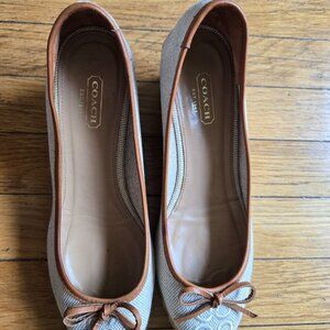 Beige canvas with Coach “C”’s on toes, brown leather edging & bows, & tan braided wedge heels.
