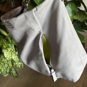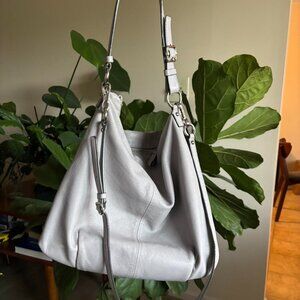 genuine leather, crossbody bag, grey handbag, structured purse, front pockets, minimalist style, practical design, crafted handbag, scratches detail, sleek accessory