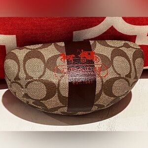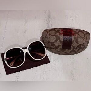 Stylish Coach “Elizabeth” sunglasses in ivory. Features oversized black lenses. Perfect for a modern look.