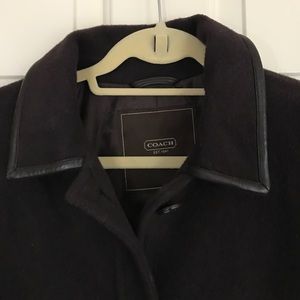 Coach Jacket, medium, brown, 4 front buttons, side pockets with leather trim, leather trim collar, perfect condition!! Length 37.75", chest 16.5", sleeves 23.75"
