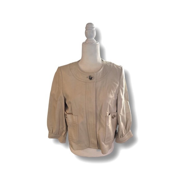 Slightly cropped bell sleeve with gold button nearest neckline that match gold stamped Coach buttons on pockets. Yes!!!! It has pockets. Three leather covered snap buttons that follow.