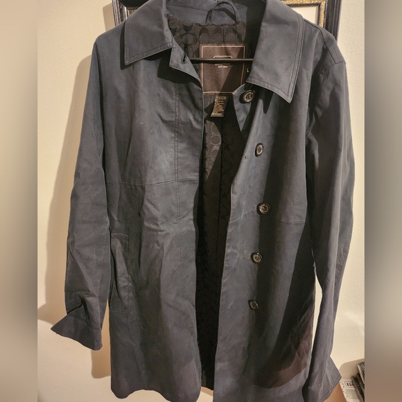 selling as is a good condition coach jacket..size large..color looks like dark blue but could pass for black..needs to be dried cleaned but no holes or rips