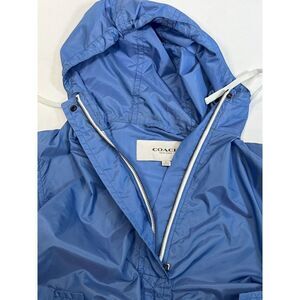 Add a stylish layer to your look with this Coach Women's lightweight hooded jacket. Crafted from lightweight and packable nylon polyester blend material, this hooded windbreaker is perfect for those unpredictable weather days. The light blue color adds a touch of chic to any outfit, while the size Medium regular size type ensure a comfortable fit. This jacket features a range of useful features, including a lightweight design and packable construction. Ideal for those on the go, this windbreaker is the perfect choice for any stylish woman.