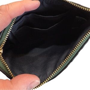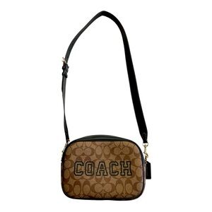 Coach Jaime crossbody camera bag in signature canvas with green leather trim. Varsity motif. Gold tone hardware. Adjustable strap. Inside and outside in like new condition.
