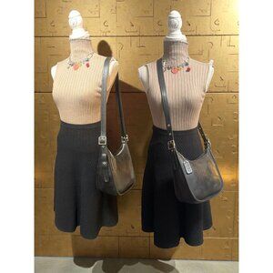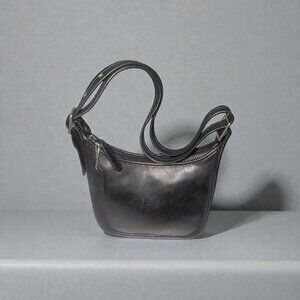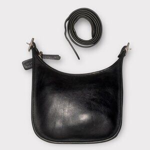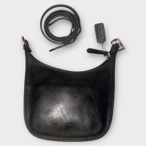 - Soft black leather body and strap which is adjustable for shoulder or crossbody wear, accented with silver nickel hardware, top zip closure and original hang tag.