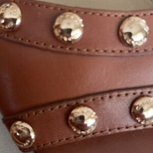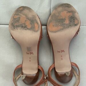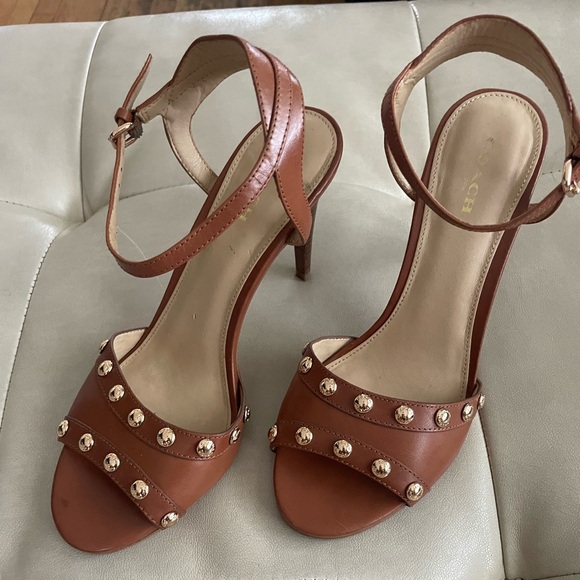Authentic beautiful heels. Color is saddle. Gold studs. Ankle Strap. Worn once. There is a small dark spot on the right toe of the shoe shown in pics. 4 inch heel. Worn once. Nonsmoking home.