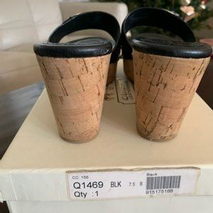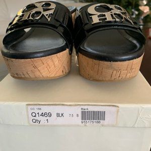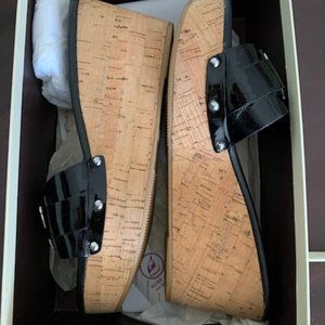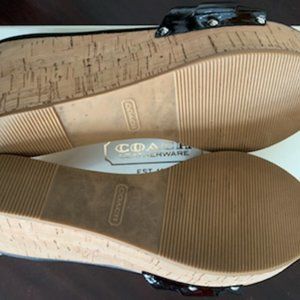 In great condition. Coach ‘Jen’ Slide Cork Wedge Sandals. Black patent leather with Coach logo.