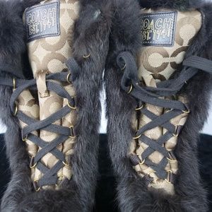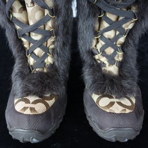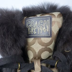 Coach Jennie signature monogram tan and brown lace-Up faux rabbit fur winter boots.