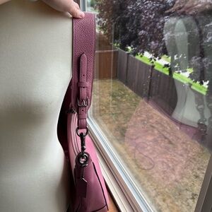 In excellent condition, like new! Barbie pink leather with gunmetal hardware. Zip top closure with multiple pockets inside. Wide and thick shoulder strap so it will never fall off your shoulder!