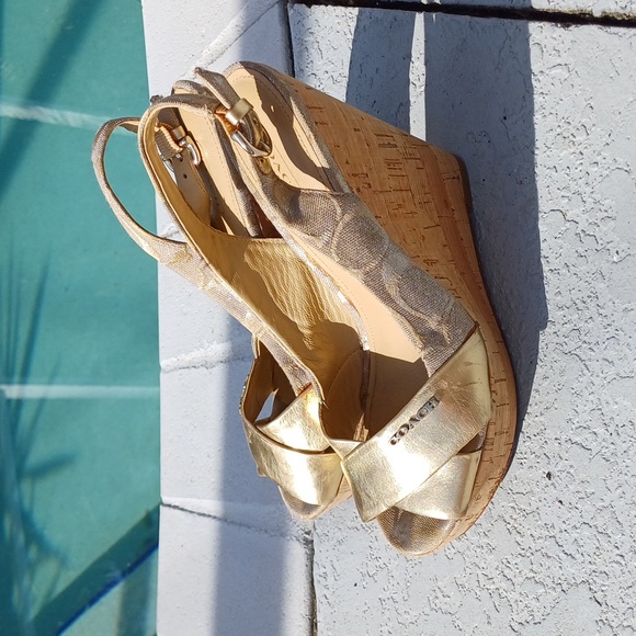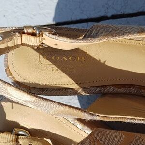 Coach Jessy monogram Jacquard & Leather wedge sandals. Size 7.5. Measurement in pics. Preowned fair condition. wear on soles and insoles. Some wear on toe area. Some scratches on the gold leather areas. Smoke free home
