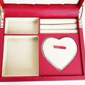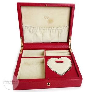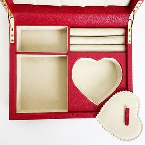 Authentic, preowned, vintage Coach Jewelry Box or Travel Case in red leather, circa the 90s. Lined in pigskin w/elasticized pocket, heart shaped pocket, ring holder & two open storage sections. Preowned/vintage with signs of use & prior wear: missing it's original key, so case will not lock; one spot to interior (see last pic, circled in black); some marks to bottom (pic 4, bottom right). Measures appx 9in L x 7in W x 2.5in D. Handmade in Spain.