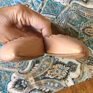 Coach Jill Flats, known for their pointed toe, scalloped edges, and stud detailing. They are made from calf leather with a slight sheen and feature soft leather linings. Leather natural colored scalloped edge, studded ballet flats in size 6. Very good used condition, no flaws but some wear. rub on the inside upper lining of the toe pocket on each shoe not noticable from outside. No major discoloration or soil on the outside of the upper shoe but normal wear at toe point and edges where sole meets leather upper. These have leather sole with wear consistent with age. See all images for detail and condition. Great pre-owned Jill. Cottagecore, farmcore