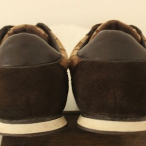 Coach logo signature monogram brown canvas w/side stripe. Brown suede heels and toes. I believe these are the "Joss" style. So comfortable; stay chic when traveling!
