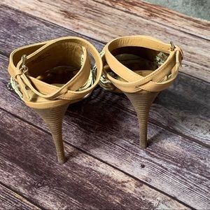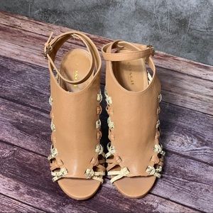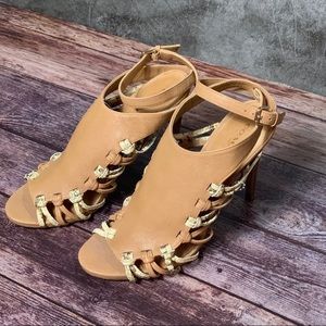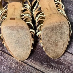 Coach: Jody mix textured sandal, a modern mix of snake-scale texture and satin-touch leather style a sleek sandal structured with knotted straps and a sky-high heel.