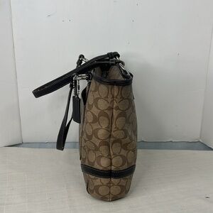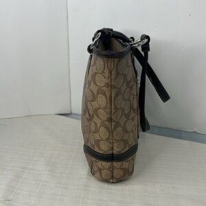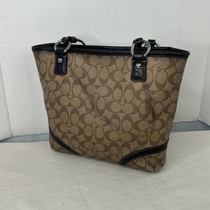 COACH Peyton Brown Signature Tote Bag Purse. Pre-owned. ln decent condition small marks. Inside is in good condition. Sold as is. See photos. 100% Authentic • Outside 1 pocket on Front, Inside has 1 zipper pocket and 2 slip pockets. • With Patent Leather trim and straps. • Lightweight with top zip closure. • Leather Tag. Dimensions: Approx: 14” L x 10.5” H x 3” D 9” with Strap dropped.