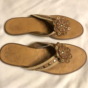 Coach Kelby 🌸 flower gold hardware, latte leather flip flop sandals used good condition