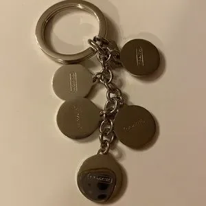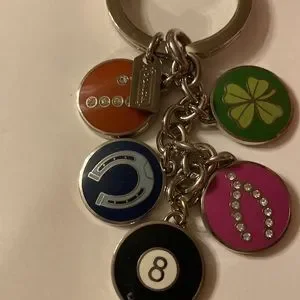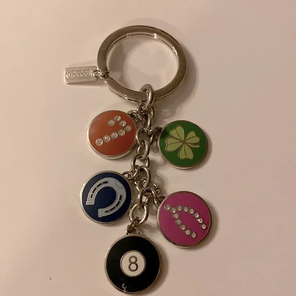 Coach Keychain in silver tone with 5 lucky charms the number 7, four leaf clover, 8 ball, wishbone and horseshoe. This is brand new and has never been used. Comes in a standard grey box.