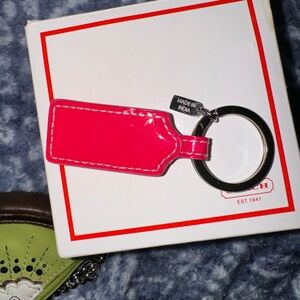 Fuschia patent leather padded fob with silver metal embellishments and Coach plate