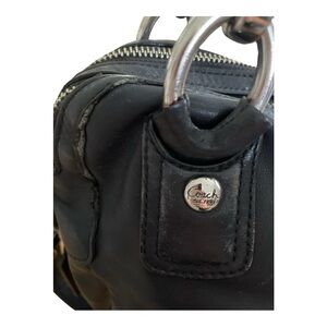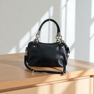 Chic black leather satchel/shoulder bag by Coach. Features sturdy handles and sleek design. Ideal for everyday use.