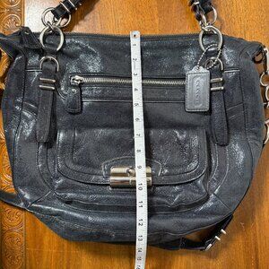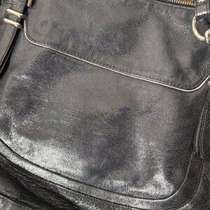 This is a heavy, large leather bag in great condition. Not your typical black Coach bag- the finish is shiny yet flat- unique.
