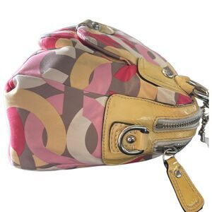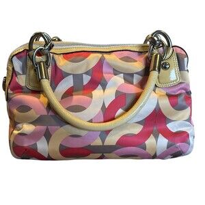 The Coach Kristin Chain Link Multicolor Print Satin Shoulder Bag is a stylish and versatile accessory for women. Featuring a vibrant multicolor exterior and yellow leather handle/strap, this shoulder bag is both fashionable and practical. The silver lining adds a touch of luxury, while the satin exterior material adds a touch of elegance to any outfit. Perfect for everyday use or special occasions, this Coach Kristin bag is a must-have for any fashion-forward woman.