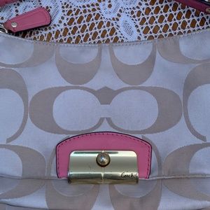 Coach crossbody bag is beige, brown and pink, signature C pattern, size medium, This handbag comes with a removable long, pink leather crossbody strap and shorter pink leather handbag strap. It has a front flap over a wide pocket and a gold clasp surrounded by pink leather. There are 3 inside pockets, one with a zipper and it has a top zipper closure. Used in great condition