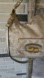 Soft gold Kristin satin like fabric shoulder bag. Signature C. Double handle. Goldtone hardware. Leather trim. Front pocket. Zip top. Clean lining. See pics and video of some markings...mostly on back and corners. Did not try to clean them so they may come out with cleaner. Nice bag.