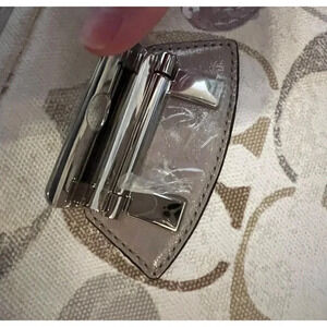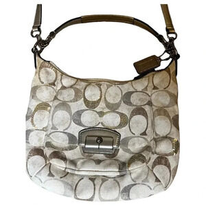 This Coach Kristin hobo bag is a stylish and versatile choice for any occasion. The beige canvas exterior is accented with sequins, giving it a touch of glam, while the silver hardware and leather shoulder strap add a classic touch. The bag features a zip closure and satin lining, with a keychain, detachable strap, and bag charm included as accessories. It is perfect for travel, casual outings, workwear, or business meetings. The bag has a spacious interior and is sized as OS, making it a must-have for any fashion-forward woman.