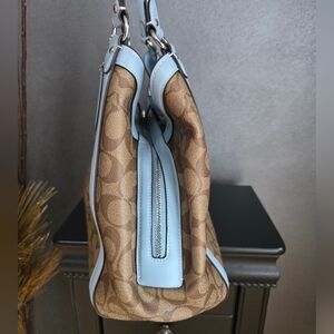 Elevate your style with the Coach Signature Tote Bag. Featuring a classic brown pattern with elegant blue accents, this bag is perfect for any occasion. Enjoy the blend of fashion and functionality with Coach's timeless design. In very good used condition, see images for more references if the item condition that described the most.This is a pre-owned item and being sold “AS IS” if you have any question regarding this item please add to bundle and a message. I described my items as the best as I could and please see images for more reference of the products. Product color may vary slightly due to photographic lighting sources or your monitor settings.