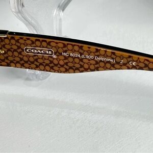 “Delphine” L900 Sunglasses by Coach. Brown lenses and tortoiseshell frames. Never worn. Coach logo square at temples. One size. Lenses measure each 1-5/8” h x 2.5” w. Condition: New without tags. Smoke free and pet free environment. Case not included.