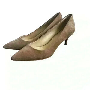 A pointed-toe pump with a vintage-inspired profile, this shoe is a soft suede with a versatile mid-heel height. Leather lining and a lightly padded sole. In excellent condition, minor wear on soles and no damage. A nude/beige color, heel height is 2 1/2”.