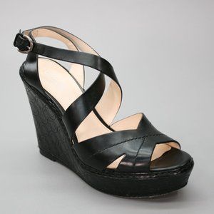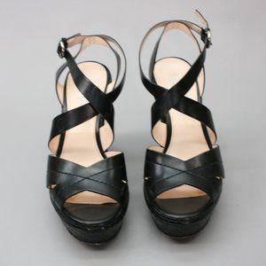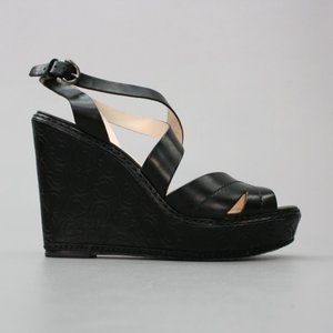 A pair of women's Coach Madeline strappy black leather open toe platform wedge heels