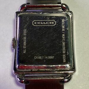Coach Ladies Cuff Bracelet Watch: CA.7.14.0687. Silver tone bezel and bracelet. Water resistant to 3 ATM/ 30 Meters. Fits up to 6 1/4" wrist.