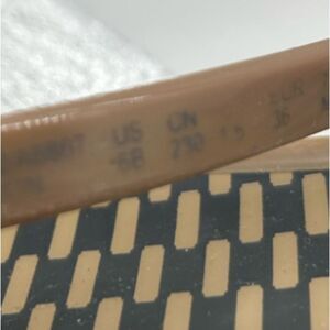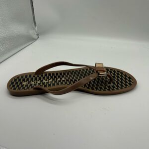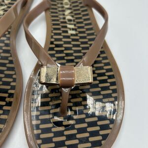 Landon Jelly Flip Flops from Coach. Brown with gold-tone bow accent. Size 6B. Light wear and some scratching of metal bow. See photos for full condition.