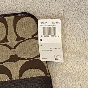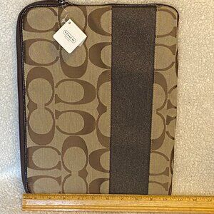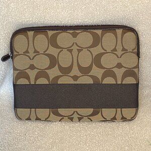 Chic and timeless Coach laptop/tablet sleeve in the brand’s classic signature “C” jacquard canvas. Features a durable brown fabric band detail, zip-around closure, and sleek leather trim. Perfect for carrying your laptop, tablet, or important documents in style.