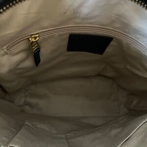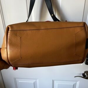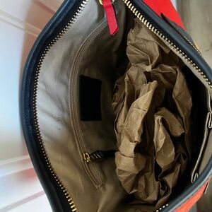 Style No. CBQ74 Coach Red, Blue and Tan glove tanned leather, Inside multifunctional pockets with 12" - 18" shoulder strap; 11" x 14-1/4" x 6". No reconditioning needed here, this is in brand new condition. It's perfect assessor for Fall/Winter wardrobe.