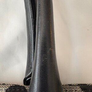 Black-gray signature fabric. Black leather pocket across front with gold clasp. Very good condition, some wear on handle.
