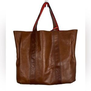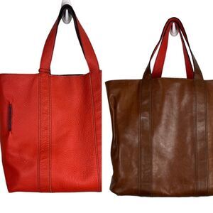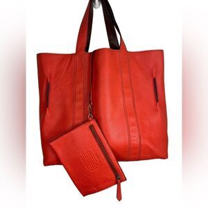 Fabulous Coach bright orange/camel brown leather reversible tote bag with coordinated zip close pouch. The oversized tote measures 17"W x 15"H x 6"D, and the pouch is 8.5"W x 6.5"H. It's in very good pre-loved condition, and is exceptional quality! The orange side is perfect, like new. The caramel leather side has some scratches/bruises. See photos.