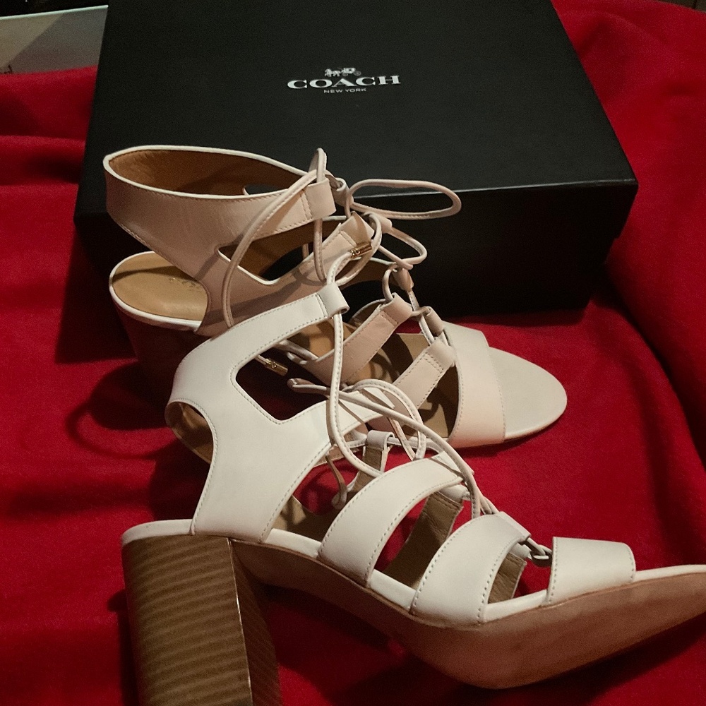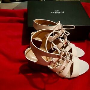 Coach Larissa, 3 inch heel sandals, with tie up ankle. Brand new, never been worn, in the box, color chalk.