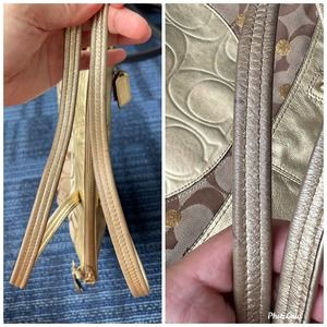 Beautiful Large Coach Tote Brown and Khaki Signature Jacquard with red hearts and gold balls with Gold Metalic trim and shoulder straps.
