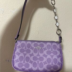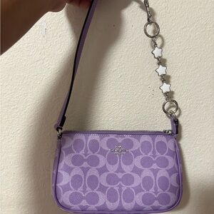 Stylish Coach wristlet in lavender. Features signature pattern and elegant chain detail.
