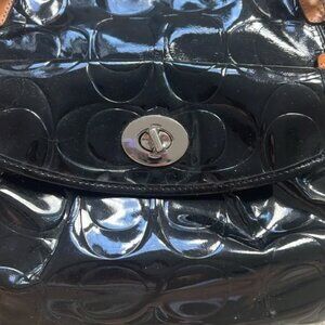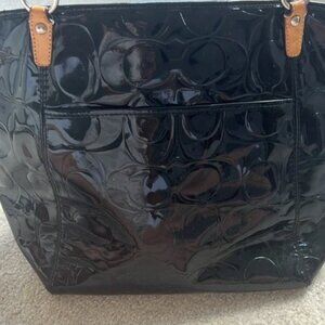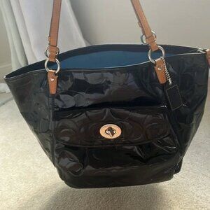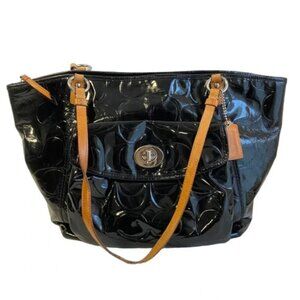 Coach Leah Black Patent Leather with Tan Straps logo Embossed Large Tote