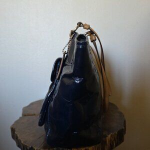 Coach Leah Embossed Patent Leather Tote in Navy Blue with tan leather trim.