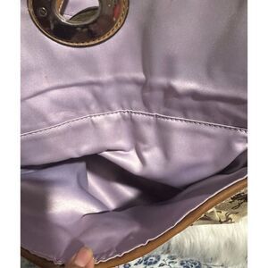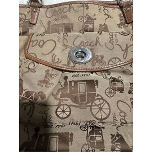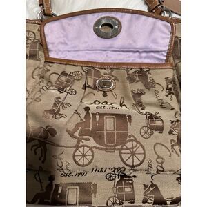 Coach Leah horse & buggy carriage print brown fabric leather straps shoulder bag has some marks on outside has stains on inside straps are nice no rips