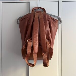Elegant tan leather backpack by Coach. A few marks on the front bottom panel and wear on the fabric of one strap.